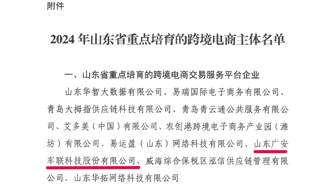 近期,山東省商務廳對外公布了《2024年山東省重點培育跨境電商主體》名單。山東廣安車聯科技股份有限公司,憑借其在商用二手車跨境電商領域的出色成就及顯著的成長潛力,榮獲山東省重點培育跨境電商交易平臺企業的殊榮,成為全省跨境電商產業發展的新興焦點。